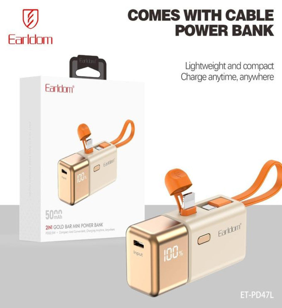 Earldom PD47 22.5W 2-in-1 Gold Bar Mini Power Bank with 5000mAh Capacity PD47L